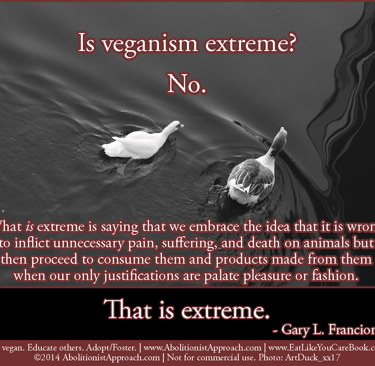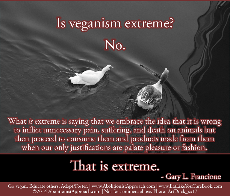 "In my judgement, veganism ought to be the baseline of the animal movement, because, as far as I'm concerned—and I think empirically—there's probably more suffering in a glass of milk or in a dish of ice cream than there is in a pound of steak. I mean, it all involves torture, but the idea that people make this distinction and say, 'Well, I don't eat meat, but I eat dairy"...To me that's about as sensible as saying, you know, 'I don't eat small cows, but I'll eat larger cows.' There really is no difference. I mean, there's suffering in the dairy product...probably more, because, if you think about it, animals used in the dairy industry are kept alive longer; they're treated worse."