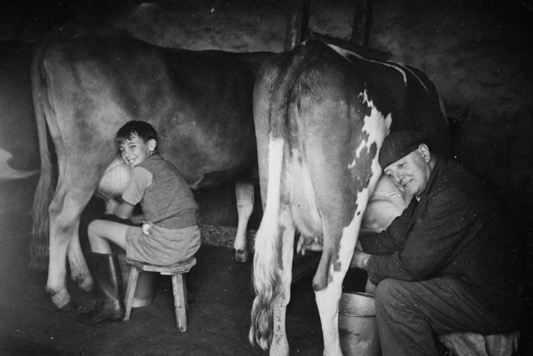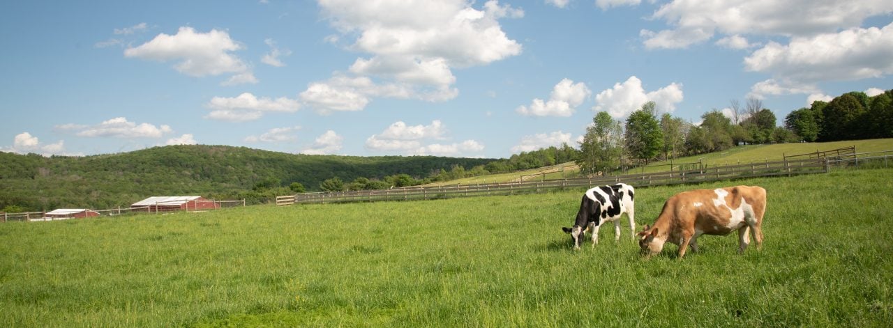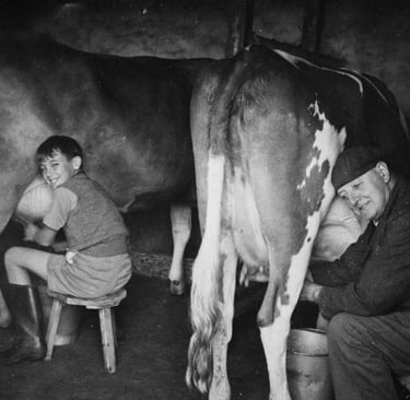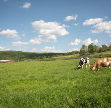 Dairy cows live outdoors on rolling green hills, pastures, and meadows, grazing peacefully all day on lush, sweet grass. Dairy cows naturally produce milk, so once a day a cow voluntarily comes down into a big red barn to be milked. Her milk is gently squeezed from her teats by either a person or by some kind of gentle machine.