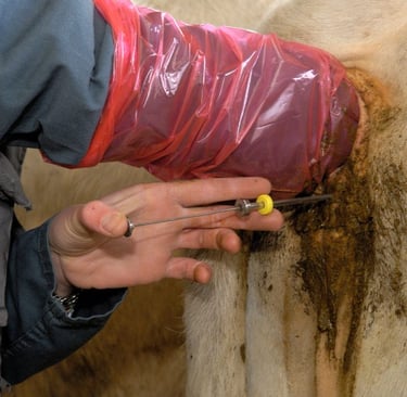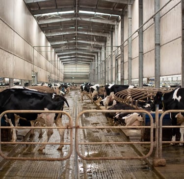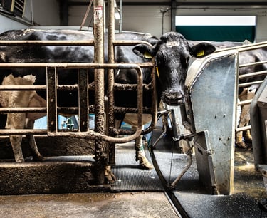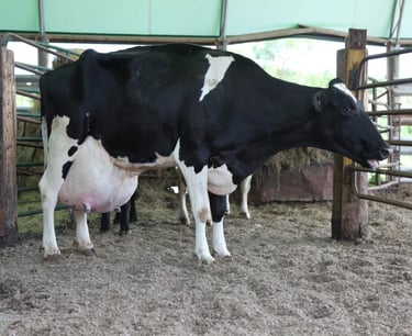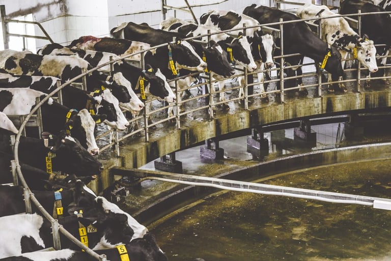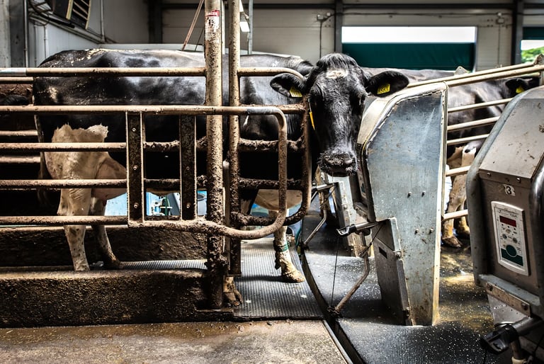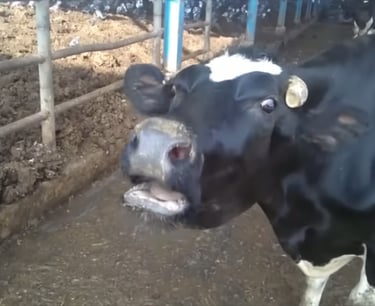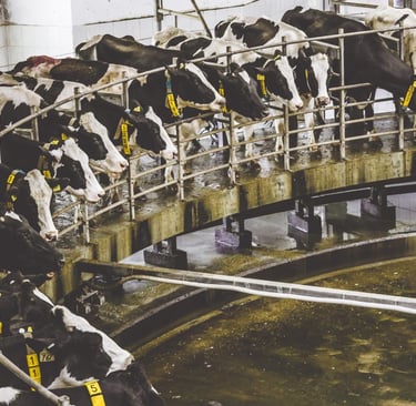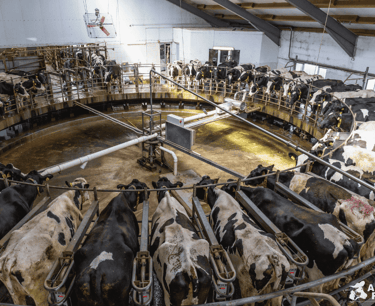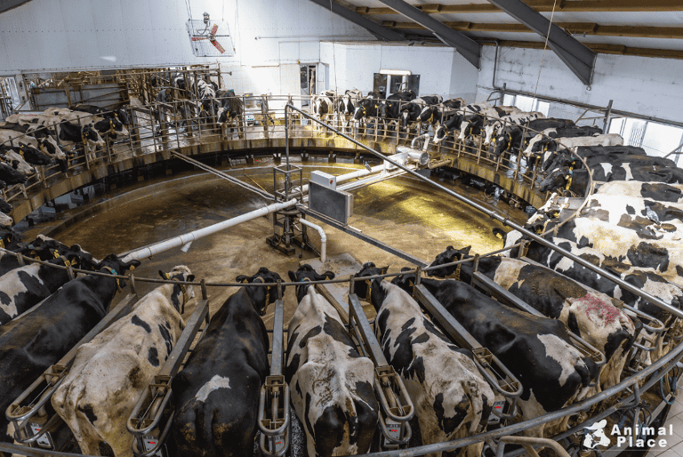 So, with their milk supply full, dairy cows are involuntarily forced into milking stalls, which are often on giant "rotary milking parlous" (where 40 -60 cows can be milked at once), and their teats are hooked up to machines that suck the milk out of their udders. This happens three times a day—morning, noon, and night. Why so often? Well back in 1950, the annual per-cow milk yield was 5,314 pounds. Today, in 2025, it is 24,200 pounds. Per cow! Per day! This increase is mostly due to selective breeding through semen collection.