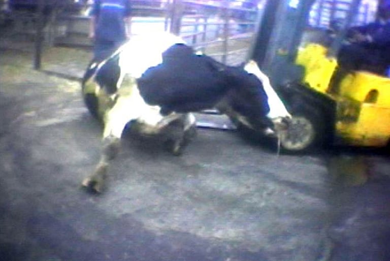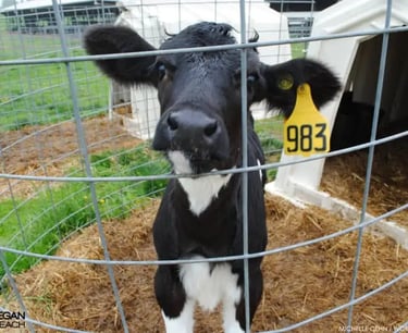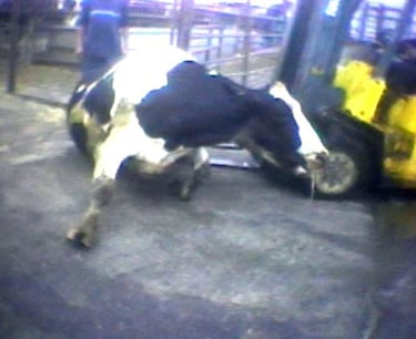 Dairy cows have numbers, not names, which are usually found on ear tags. After 3 - 5 years of intensive milk production, including the regular forced pregnancies and birthings, a cow's milk production tends to drop off and her body tends to break-down. At this point, sometimes lame and in pain, she is forced to limp into a trailer (often made to move with electric cattle prods), or, if she is too broken down to move on her own, is dragged/pushed out with forklifts into the trailer, where she is taken to a slaughterhouse and killed for beef. (A full 20% of all beef comes from dairy cows.) Nobody mourns her death.