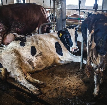 Dairy cows mostly live indoors on cement slabs or in dirt-floor pens layered with a little straw. The conditions inside these large, crowded warehouses can often be quite filthy—a mix of manure and dirt and mud. Standing and lying on cement floors or packed dirt day after day is taxing and painful for the cows.