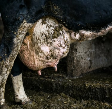 This amount of milk production and milk extraction takes a heavy toll on a cow's body. One very common condition is mastitis, which is a painful swelling of the mammary glands (teats) usually due to a bacterial infection. Nearly 20% of dairy cows suffer from this painful condition, yet are usually milked anyways. Dairy Cows also suffer from: Bovine Leukemia Virus, Bovine Immunodeficiency, Johne's Disease, Milk Fever, Metabolic disorders (such as ketosis and laminitis), and Udder ligament damage, and they are often given drugs such as: Antibiotics, Prostaglandin, and Tranquilizers, mostly administered by farm workers (rather than vets).