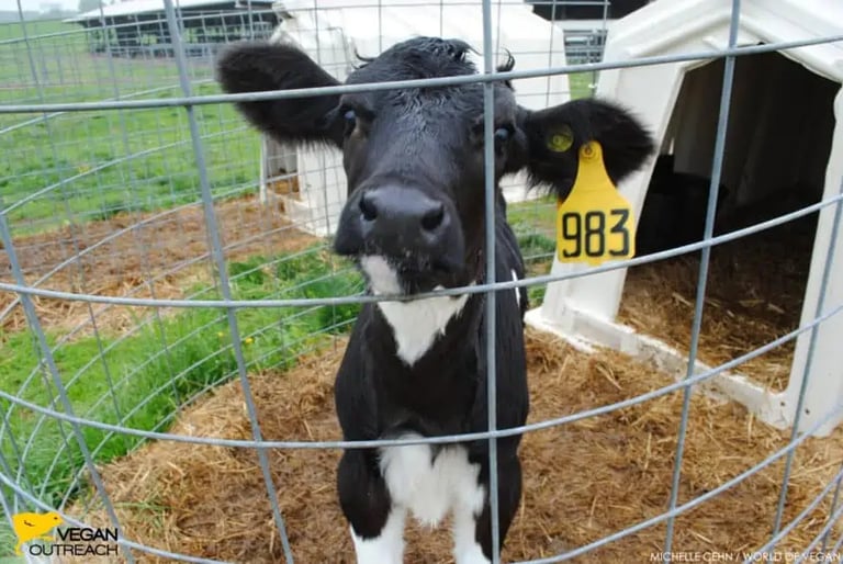 The female calves are put in individual hutches and raised to be dairy cows. The male calves and any "surplus" females are either killed immediately or raised for veal (calf meat) in tiny pens that don't allow much movement (so the meat will be soft) and then slaughtered within 3 - 6 months. (The Dairy industry IS the Veal industry!)