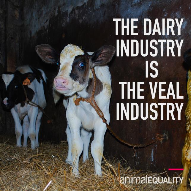 Cows must give birth to a calf every year in order to produce milk. The calves are ripped away from their mothers, usually within 24 hours (and sometimes almost immediately after birth). The female calves are raised to be dairy cows. The male calves and any "surplus" females are raised for veal in tiny pens that don't allow much movement (so the meat will be soft).